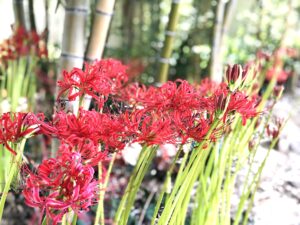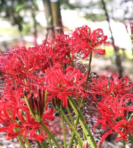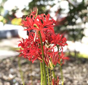 ヒガンバナ ブログ 2025.09.27 空に向かって伸びる茎 火花のように咲く赤色が印象的 この風景はヒガンバナ特有の神秘的な美しさと毎年咲く生命力に 秋の訪れの感じます 今年もしっかりと誇らしげに咲いてくれました